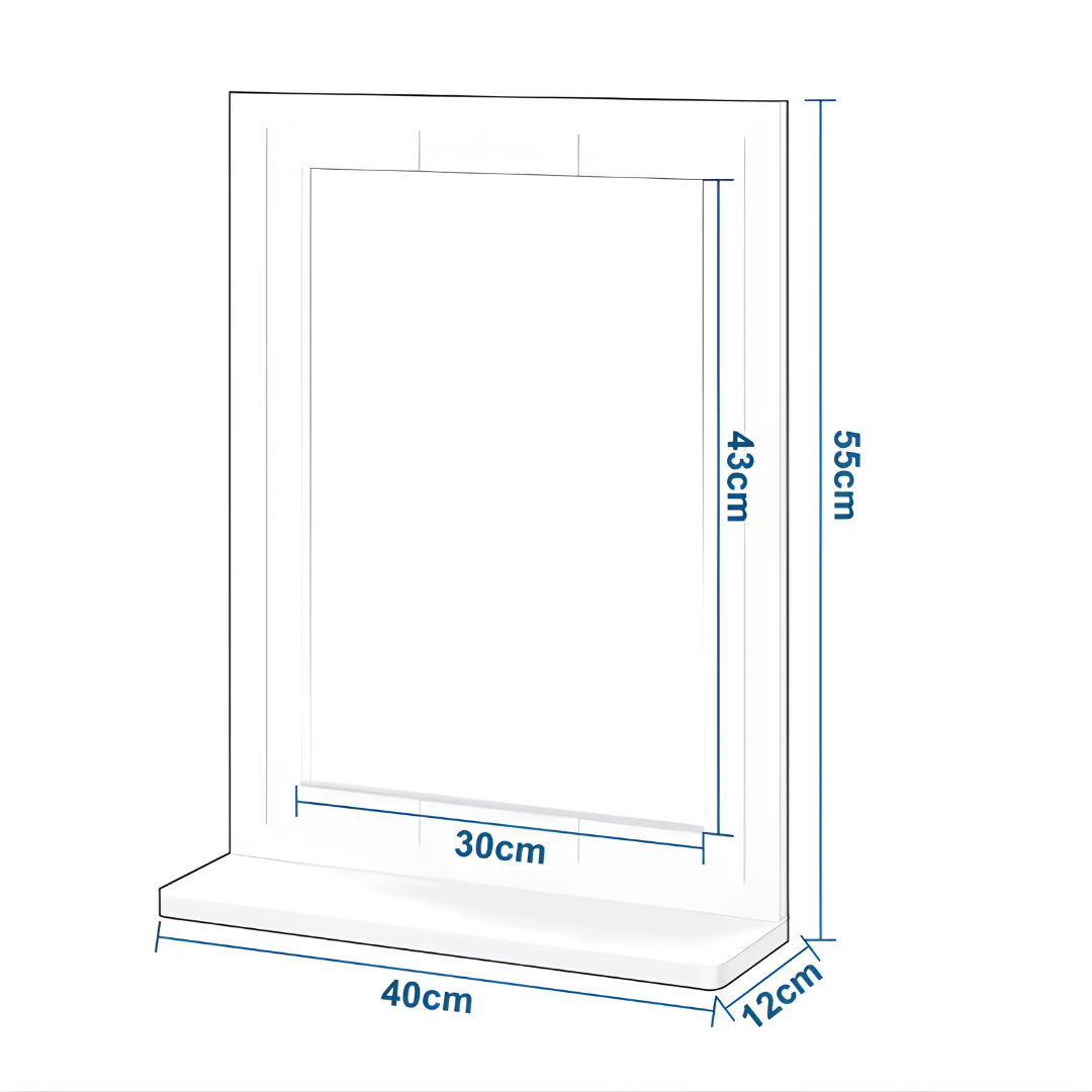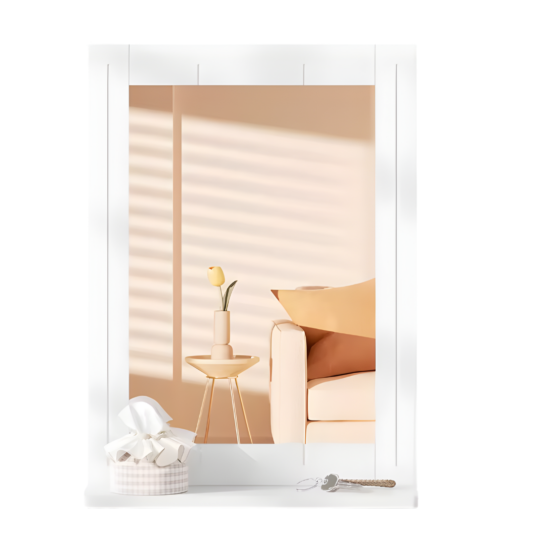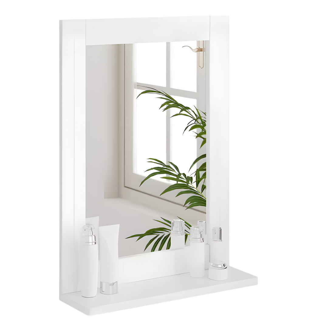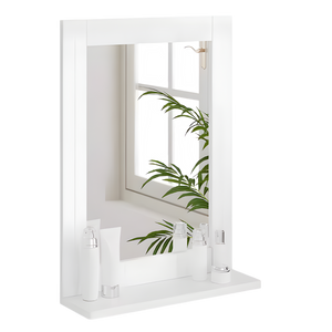 Deze compacte wandspiegel met geïntegreerde plank combineert functionaliteit en tijdloos design in één elegant geheel. Dankzij het minimalistische witte frame en het handige plateau is deze spiegel perfect voor in de badkamer, hal of slaapkamer. Ideaal voor wie functionaliteit wil zonder in te leveren op stijl.