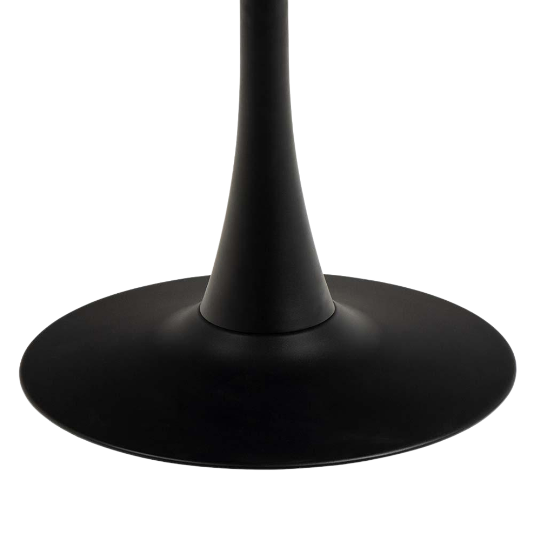 Stijlvol onderstel: De stalen trompetvoet zorgt voor stabiliteit én geeft de tafel een moderne, sculpturale look.