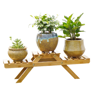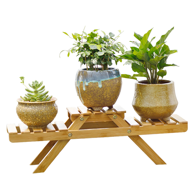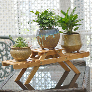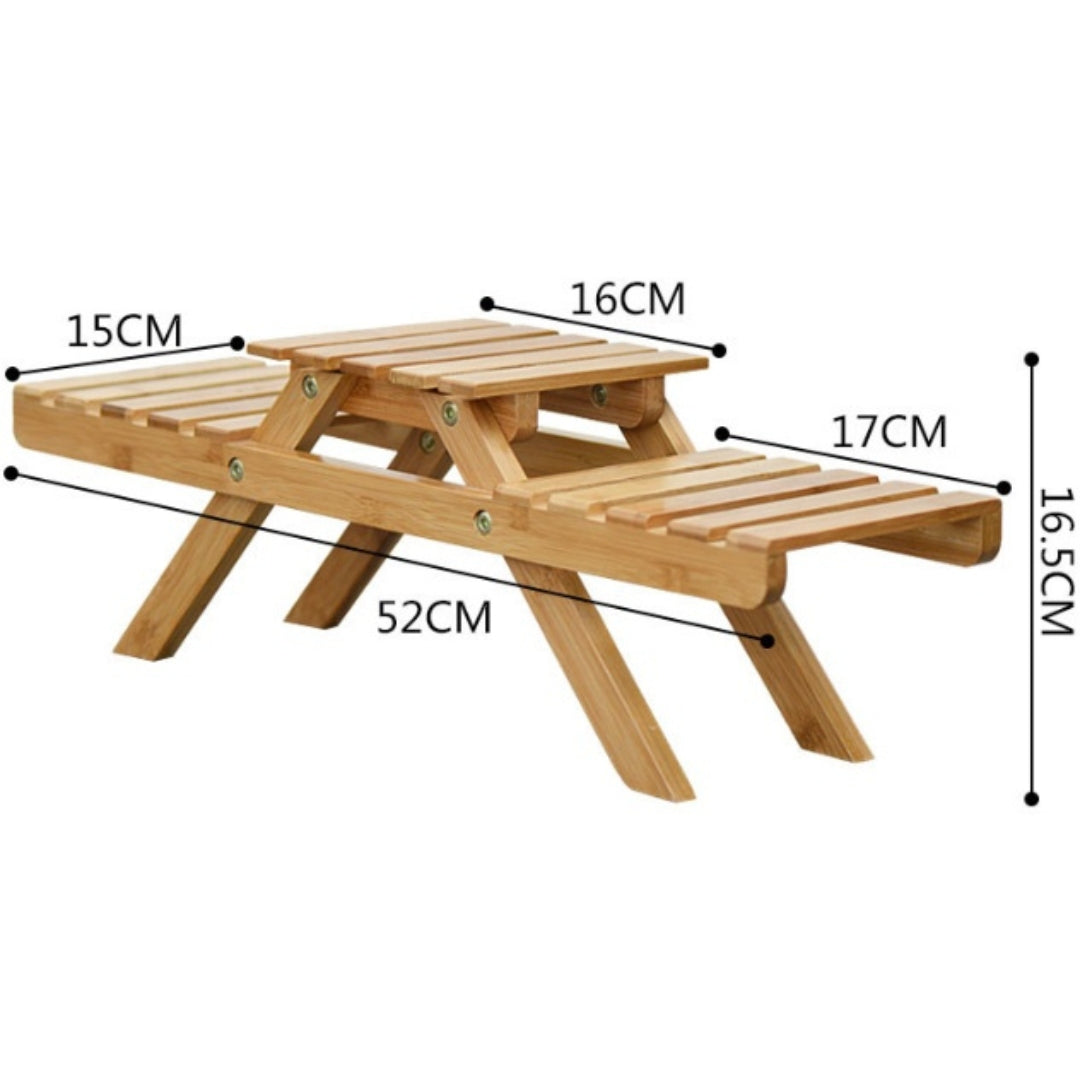 Deze houten plantenstandaard in picknickbank-stijl is een stijlvolle en speelse manier om je favoriete planten een podium te geven. Dankzij het slimme, compacte ontwerp past hij perfect op tafel, vensterbank of in een open kast. Gemaakt van natuurlijk hout, zorgt deze stand voor een warme, huiselijke uitstraling.