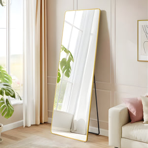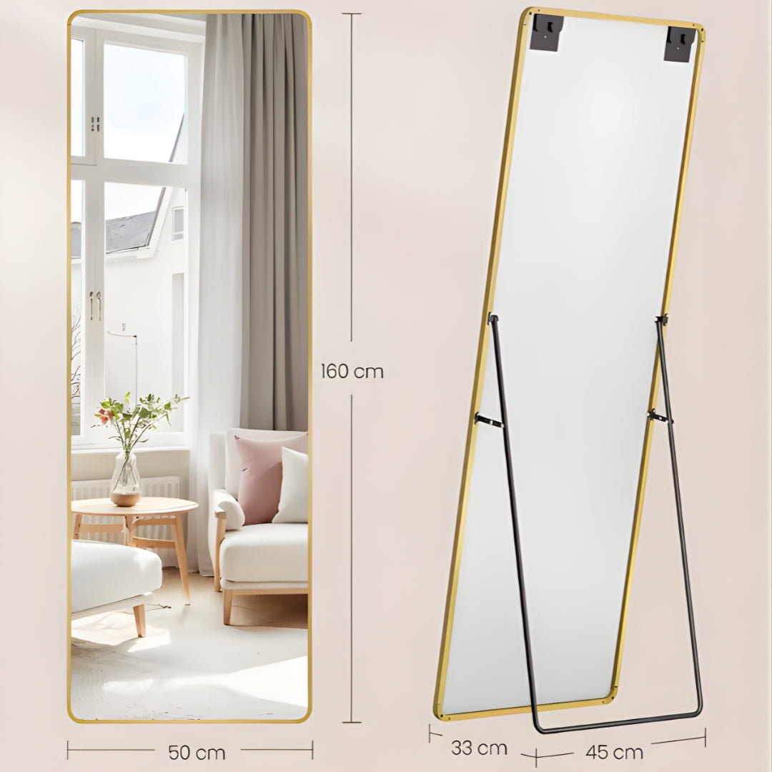Deze elegante passpiegel op standaard combineert functionaliteit met verfijnde eenvoud. Met zijn slanke aluminium frame in zacht goud en extra grote afmetingen is hij zowel een stijlvol statement stuk als een praktische toevoeging aan je interieur.