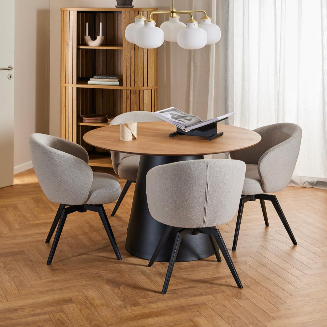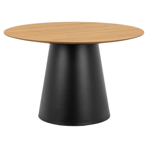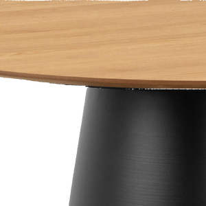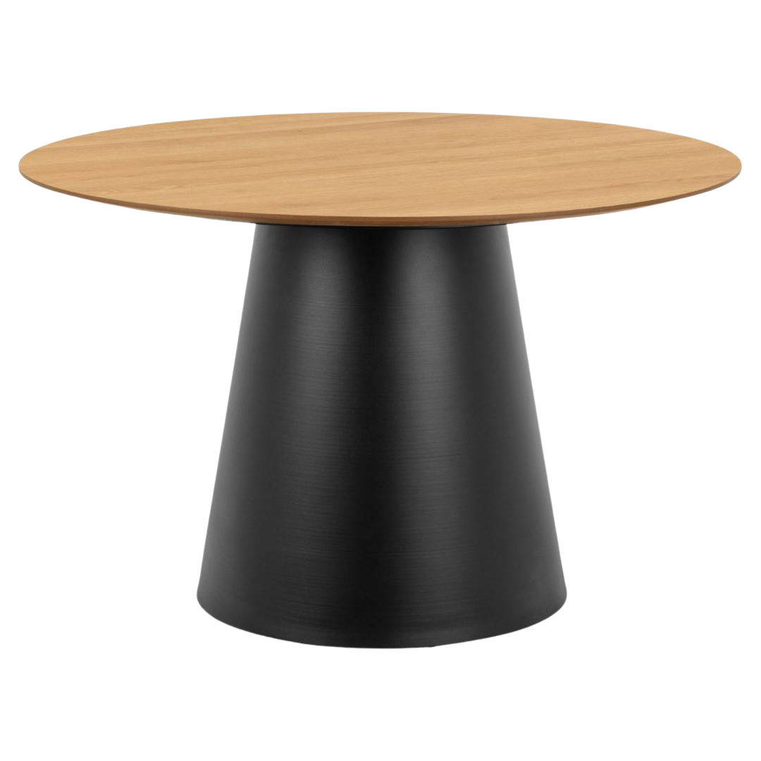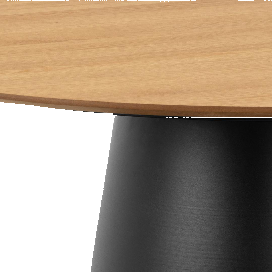 De BRAVON eettafel combineert een warme houtlook met een krachtige trompetvoet in zwart staal. Het minimalistische design straalt rust uit, terwijl de ronde vorm zorgt voor verbondenheid tijdens elk diner.