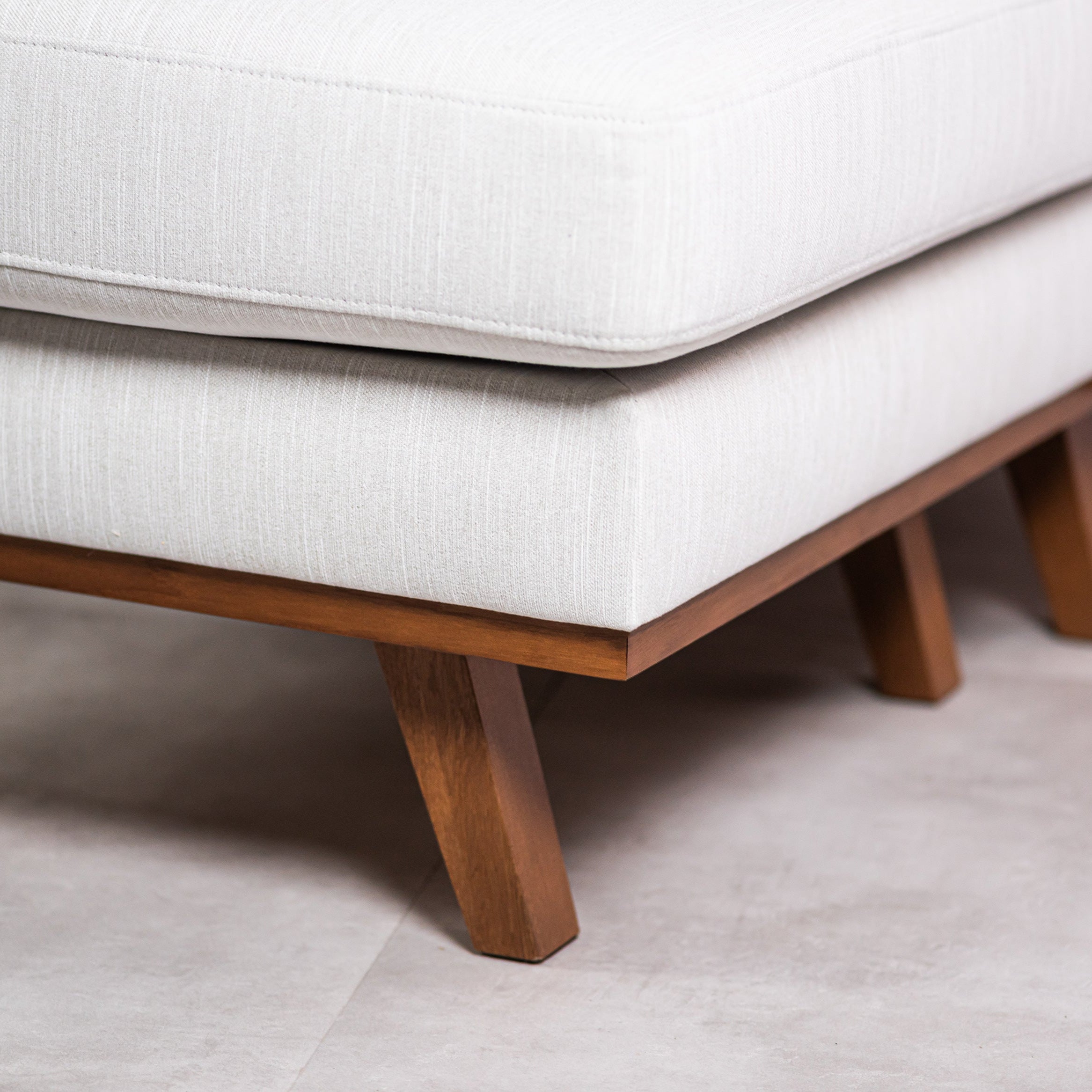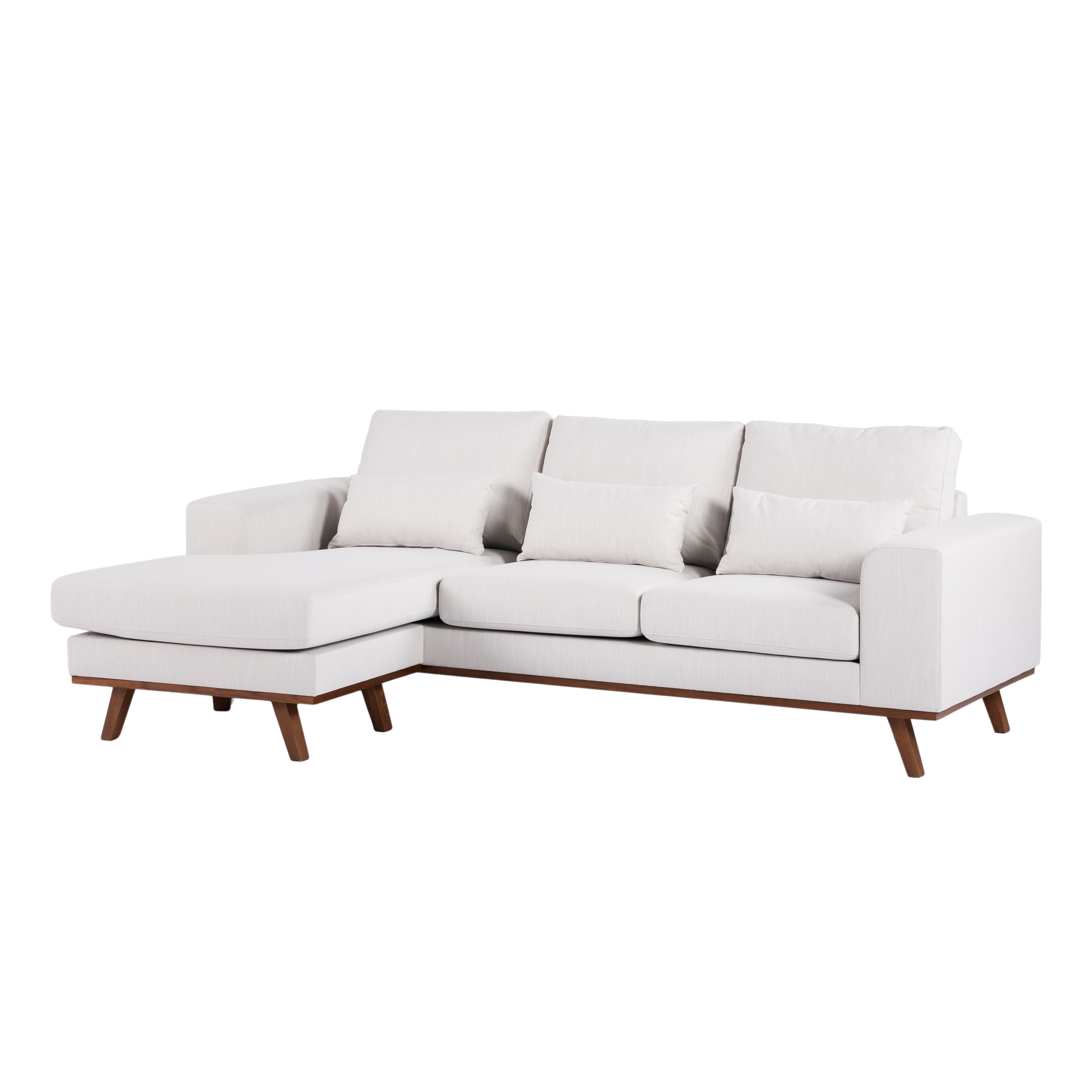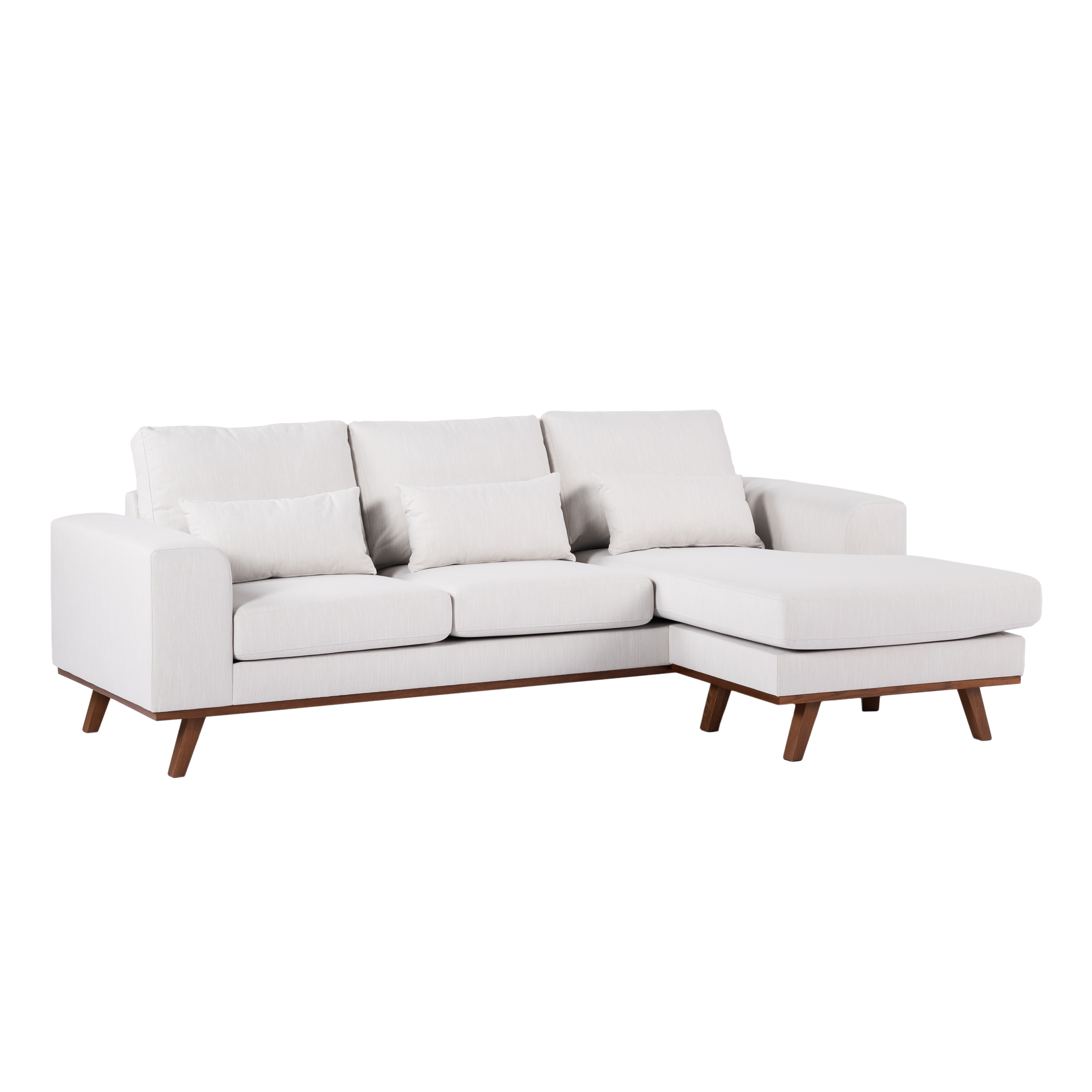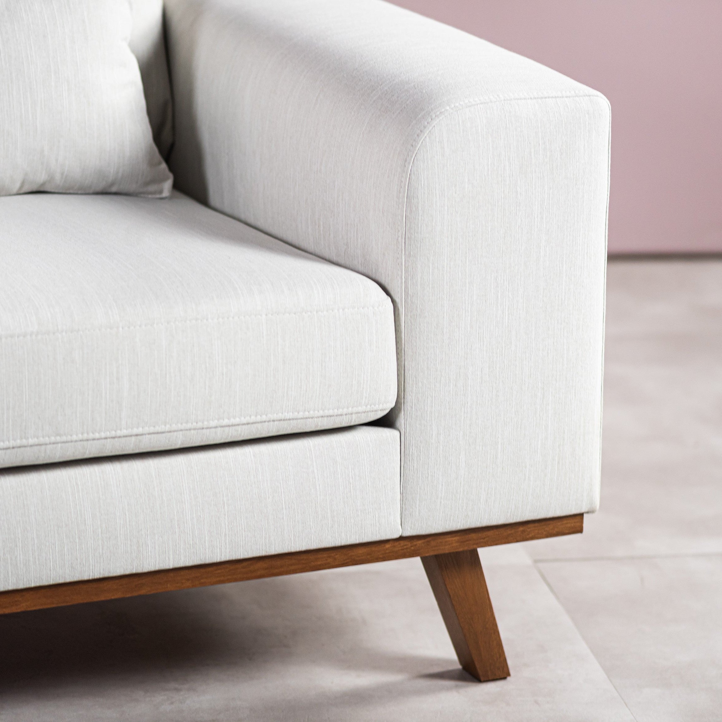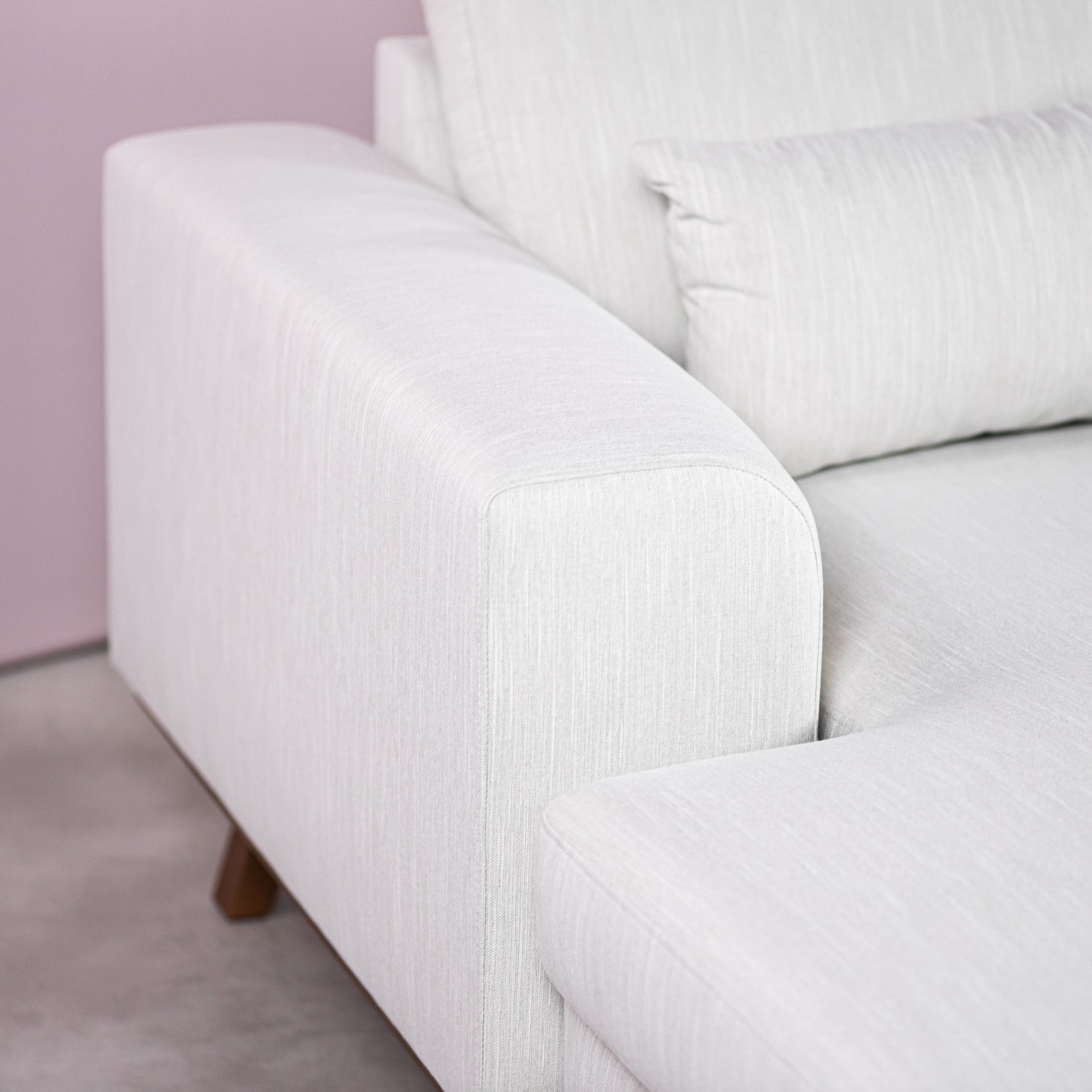 Met haar elegante beige Melva 02-stof, houten poten en keuze tussen linker- of rechteruitlijning is deze bank ontworpen voor comfort en karakter.