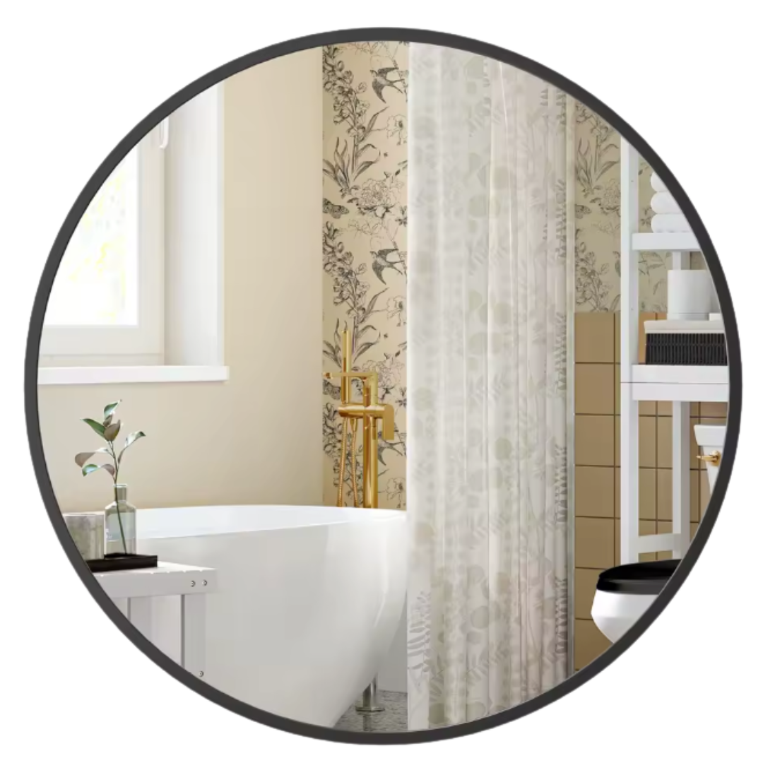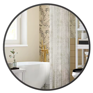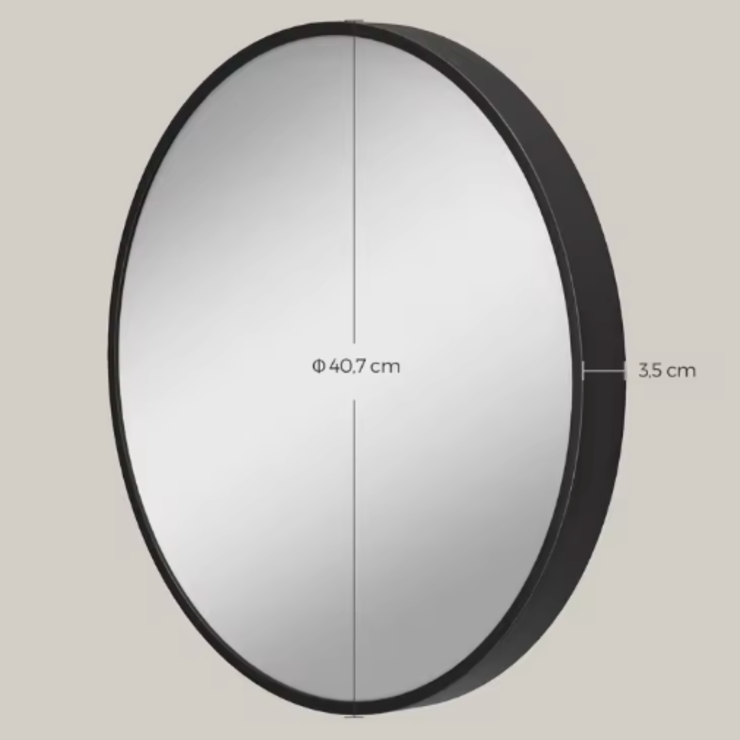 Deze stijlvolle ronde wandspiegel met zwart metalen frame voegt direct rust en elegantie toe aan elke ruimte. Het minimalistische design met industriële touch past moeiteloos in moderne badkamers, slaapkamers of hallen en laat jouw interieur reflecteren wie je bent.
