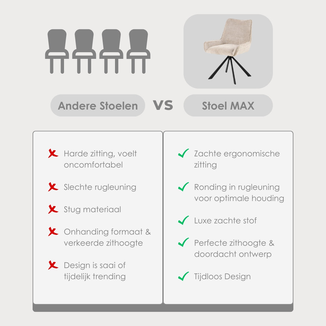 Kies voor stijlvol comfort dat elke dag opnieuw uitnodigt om plaats te nemen, ontdek de Max Eetkamerstoel.