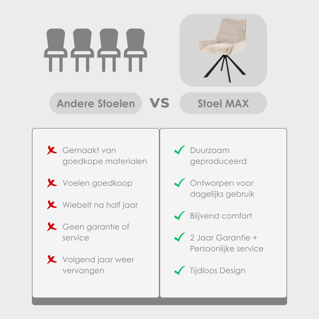 De Max Eetkamerstoel is meer dan een zitplek — het is een stijlvolle belofte van blijvend comfort, eigentijdse elegantie en duurzame kwaliteit.