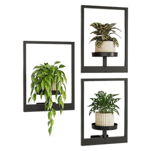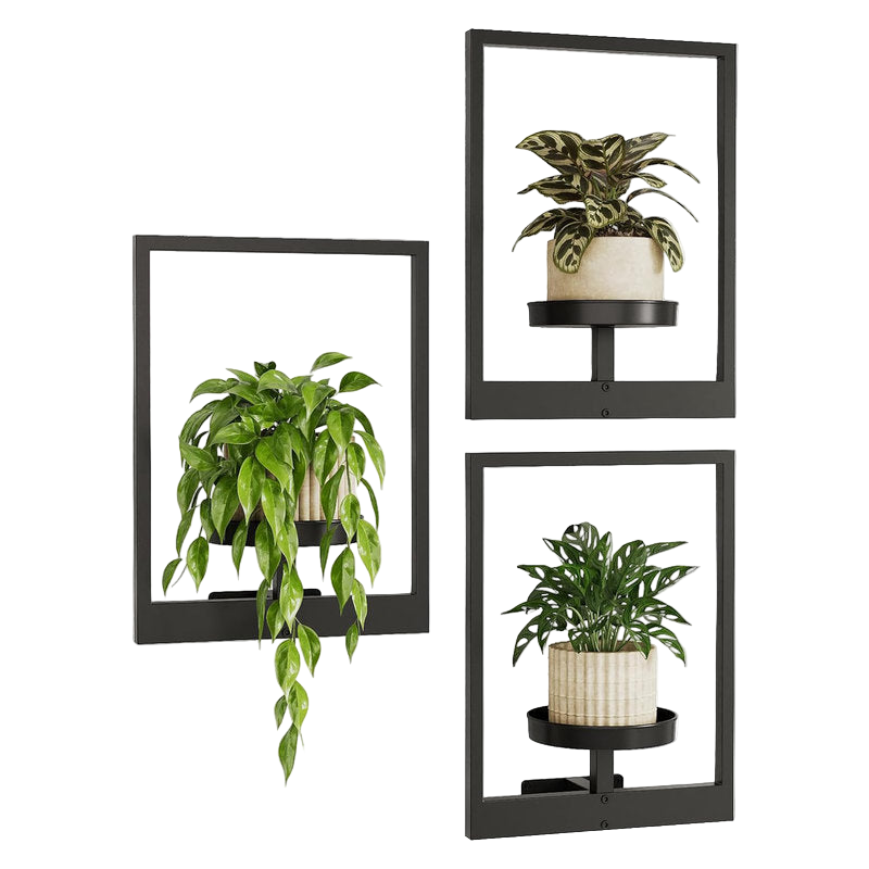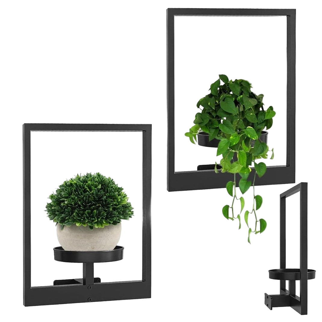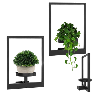 Deze minimalistische wandhouder combineert functionaliteit met strak design en laat jouw planten letterlijk zweven aan de muur. Het matzwarte metalen frame vormt een stijlvol contrast met het groen van je planten en verandert elke muur in een designstatement.
