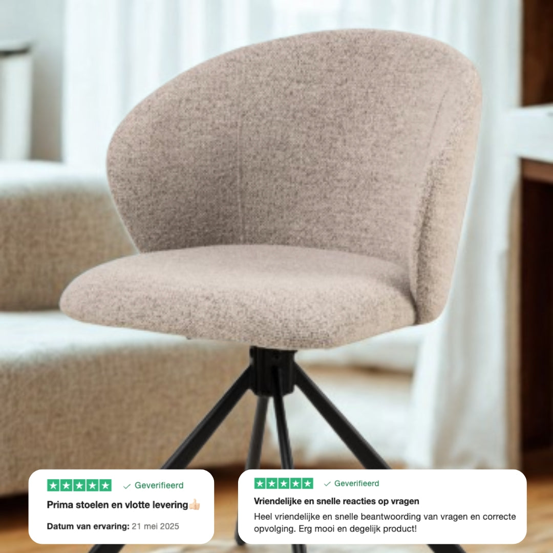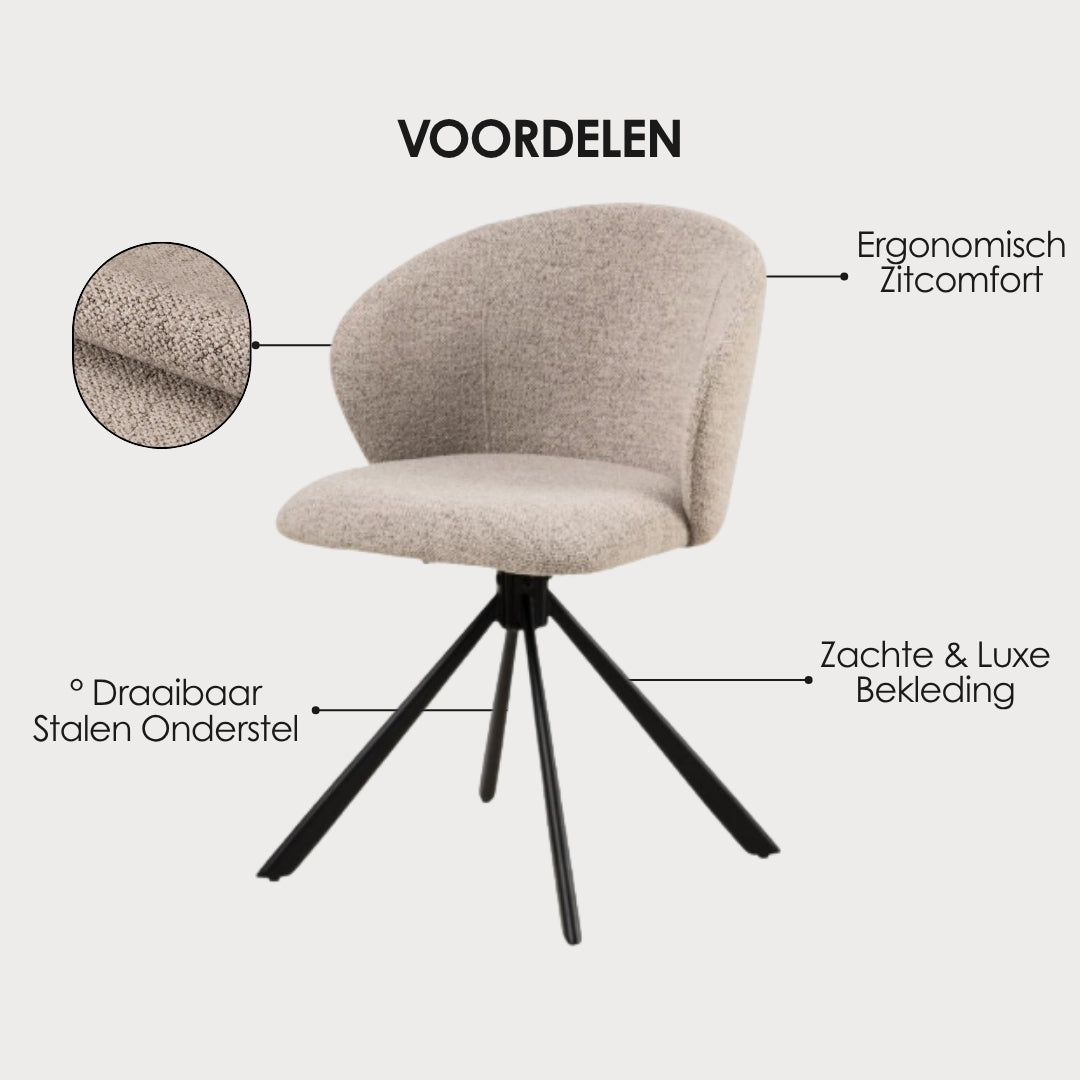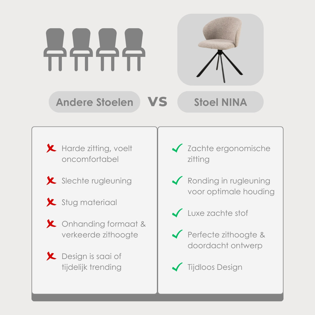 Met haar verfijnde lijnen, zachte stoffering en slimme draaifunctie is Nina een statement van eigentijds zitcomfort aan elke tafel.