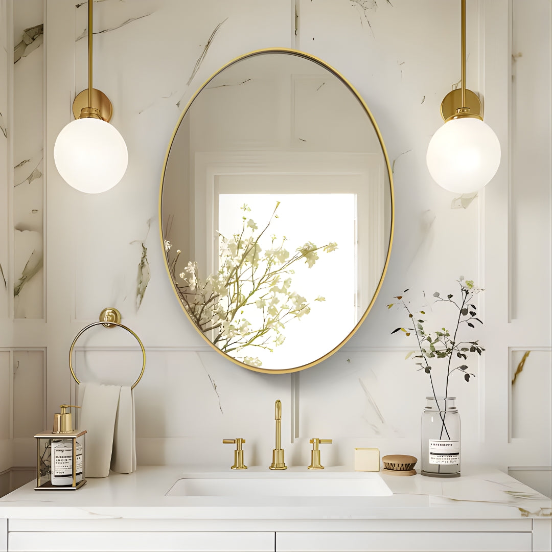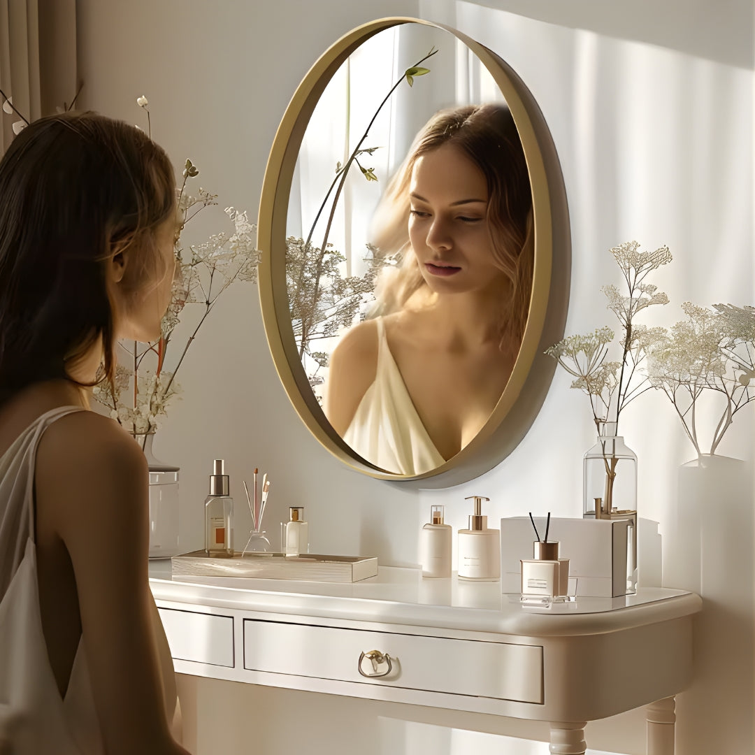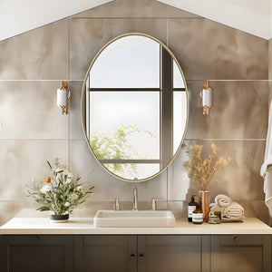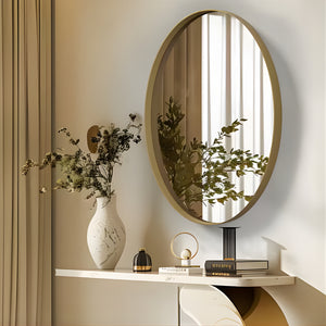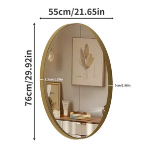 Deze ovale wandspiegel met gouden metalen frame straalt pure verfijning uit. Het minimalistische design, gecombineerd met de warme gouden afwerking, geeft jouw badkamer, hal of slaapkamer een luxueuze en tijdloze uitstraling. Perfect boven een wastafel, dressoir of als eyecatcher in je entree.