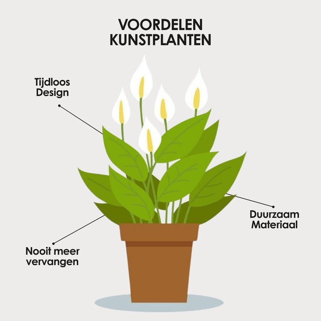 - Geen gedoe met water, zonlicht of bladverlies – altijd in perfecte staat