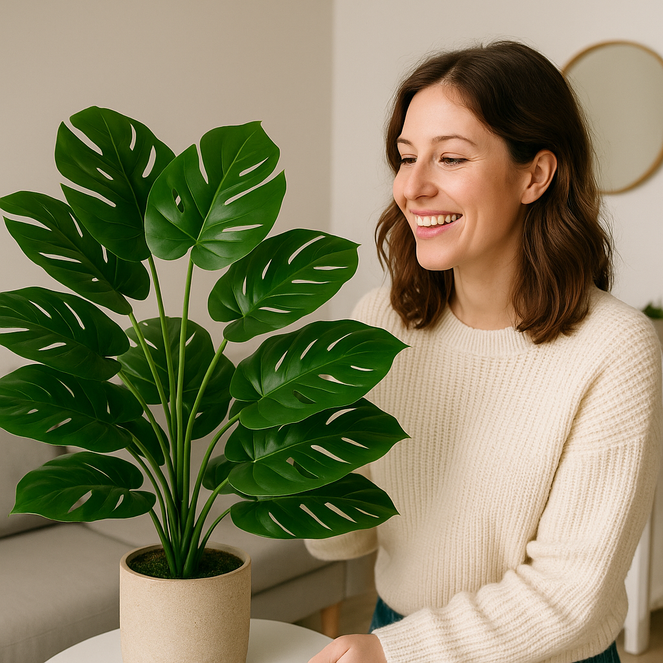 De kunstplant SYLVIA brengt een weelderig vleugje natuur naar binnen, zonder water, onderhoud of verspilling. Met haar heldergroene bladeren en elegante vorm straalt ze rust, eenvoud en bewuste luxe uit in elke ruimte.