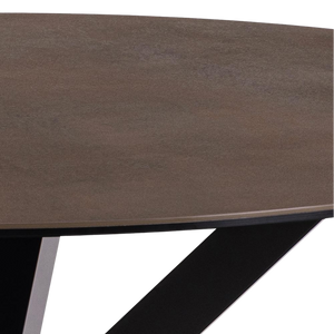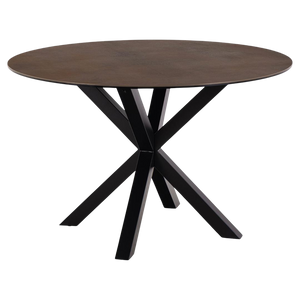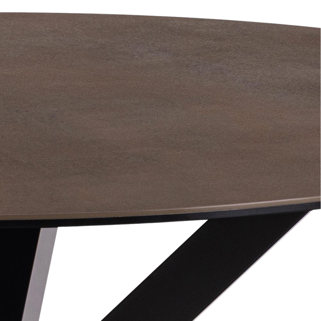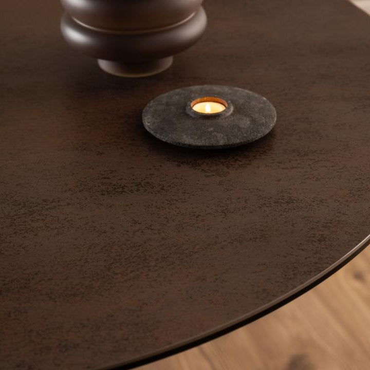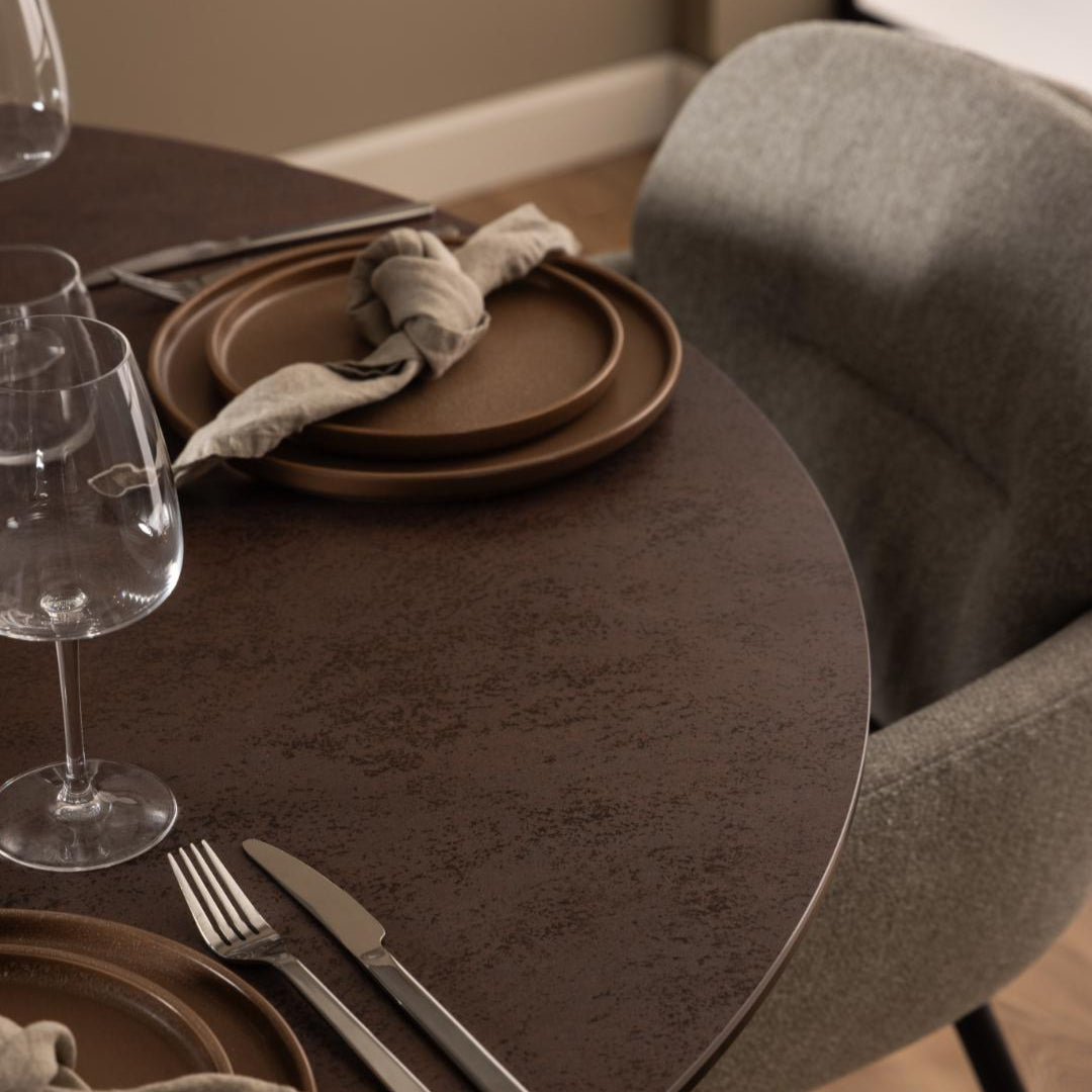 Robuuste elegantie: Het roestbruine tafelblad straalt warmte uit en contrasteert prachtig met het strakke onderstel.