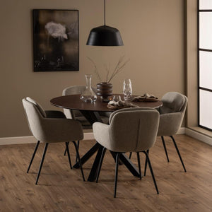 De eettafel Valmont brengt warmte, karakter en functionaliteit samen in één verfijnd ontwerp. De combinatie van een rustiek bruin tafelblad en een sculpturaal zwart stalen onderstel maakt deze eettafel tot een stijlvolle blikvanger in ieder interieur.