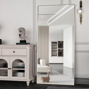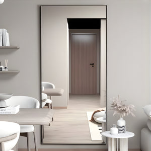 Deze moderne vloerspiegel met strak zwart metalen frame is een statement piece voor elk interieur. Dankzij het royale formaat zie je jezelf van top tot teen, ideaal voor inloopkasten, slaapkamers of stijlvolle hoekjes in de woonkamer. Het sobere design brengt rust en ruimtelijkheid, zonder afbreuk te doen aan uitstraling.