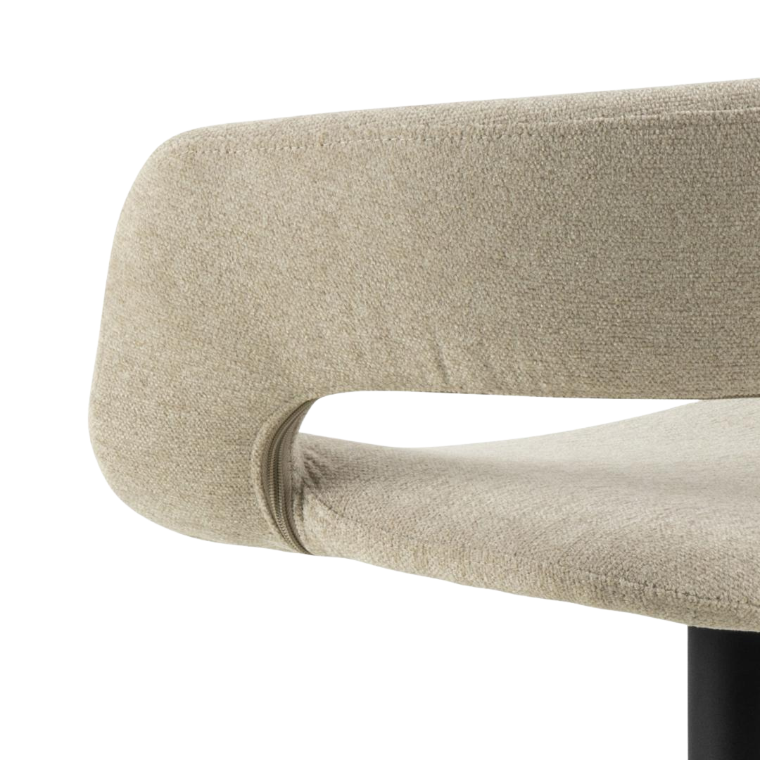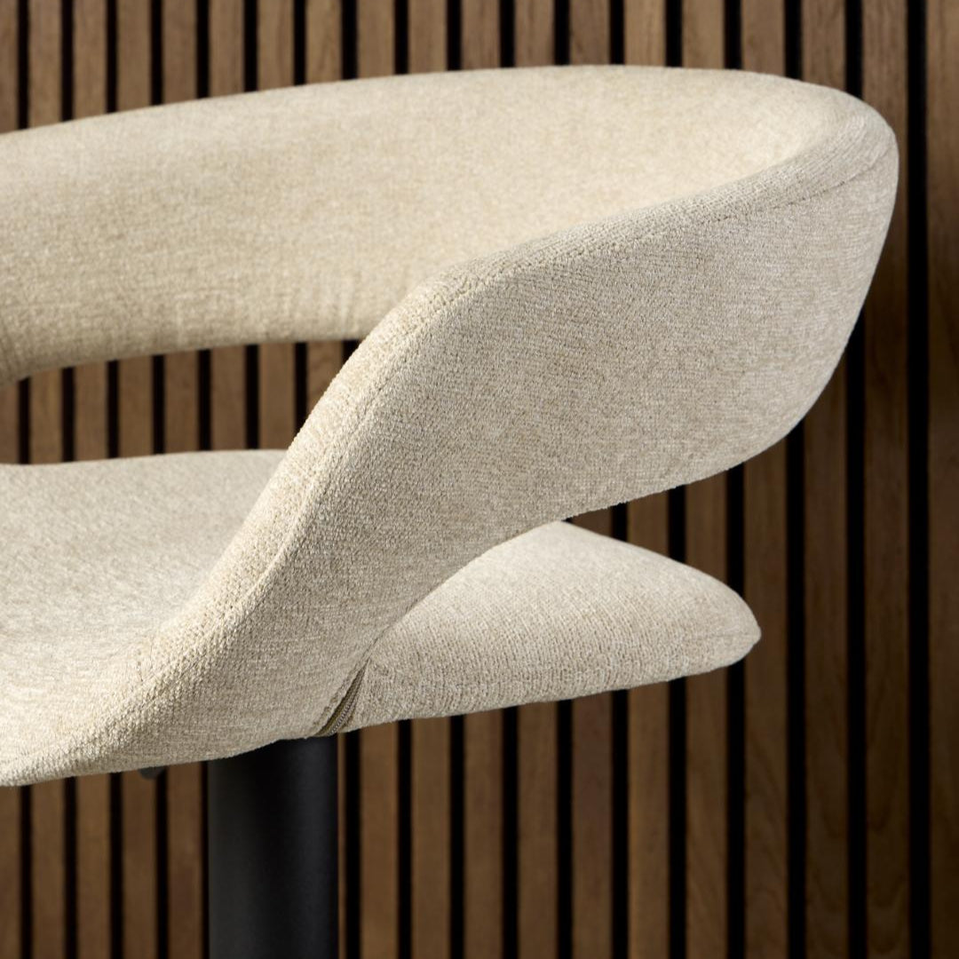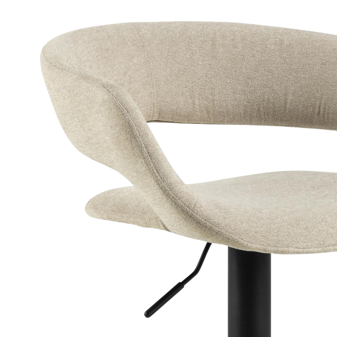 De VLADEN barkruk straalt moderne elegantie uit met een zachte chenille-achtige bekleding en subtiel afgeronde rugleuning. Ideaal voor wie comfort en design wil combineren aan het kookeiland of de bar.